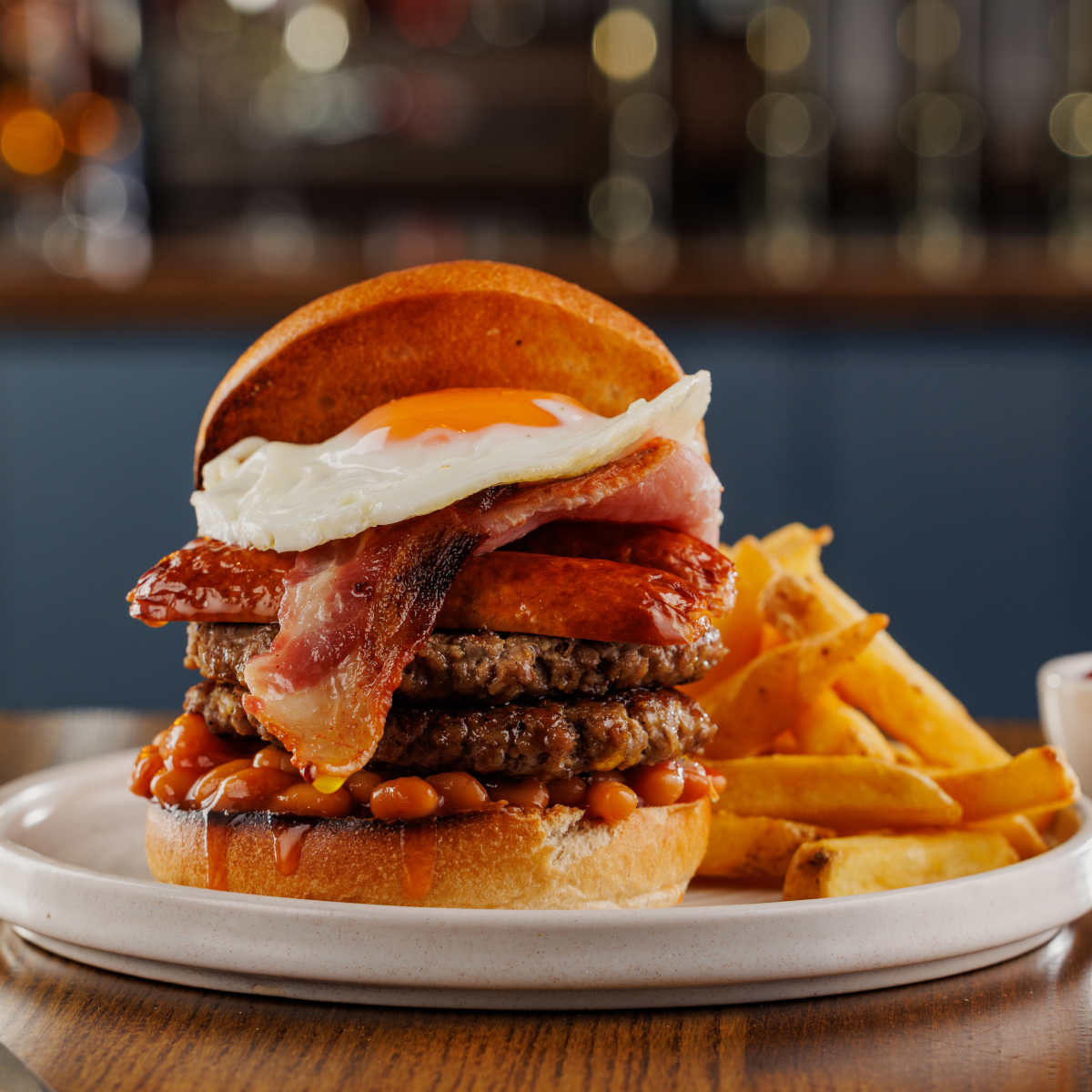 Big breakfast one, two 3oz beef patties, bacon, sausage, hash browns, free-range fried egg and baked beans | 14.49 2034 kcals